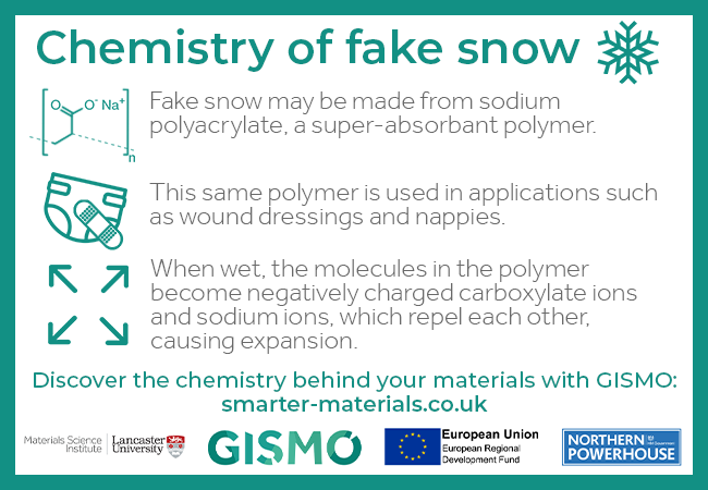 - Fake snow may be made from sodium polyacrylate, a super-absorbent polymer.