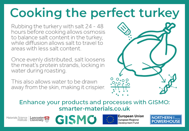 Rubbing the turkey with salt 24 – 48 hours before cooking allows osmosis to balance the salt content in the turkey, while diffusion allows salt to travel to areas with less salt content.