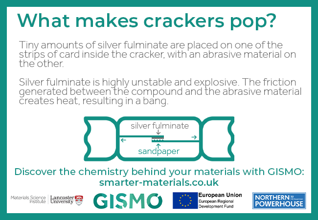 Tiny amounts of silver fulminate are placed on one of the strips of card inside the cracker, with an abrasive material on the other.